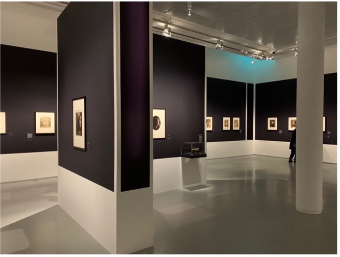 All of the portraits are hung at eye level and evenly spaced along the walls of the three gallery rooms. There’s a natural rhythm to the space, moving from one portrait to the next as you would flip the pages of a photo album (Cameron liked to package her photographs in book format to distribute them to friends and family), but the presence of half walls in the center of each gallery keeps the path through the works from becoming too monotonous. The scenography helps plunge visitors into Cameron’s world, too: the space seems to loosely quote a 19th century parlor, with its low lighting and walls painted deep violet and midnight blue. The dimness of the space throws the photographs — all sepia-toned and identically matted with cream board — into sharper focus; the portraits appear almost luminous. The beauty of Cameron’s works is put on display in this show, and it is, indeed, arresting.