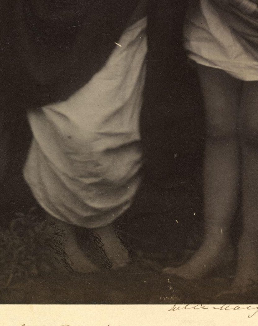The exhibition is strongest in these instances where the trace of Cameron’s touch is highlighted — a portrait of a girl dressed as Sappho printed from a broken negative, giving it the look of a cracked and repaired antique plate; a boy dressed as Paul from Jacques Henri Bernardin de Saint Pierre’s novel Paul et Virginie, whose feet Cameron scratched out to make them look smaller; or a portrait entitled The Dream, which bears two black fingerprints in the lower right corner, and which Cameron read as a kind of signature. Not only do these moments attest to the handmade quality of the photographs, they also give a sense of Cameron’s personality and identity as an artist. To that point, I wish the exhibition had given more attention to the technical side of her work, seeing as much of Cameron’s style developed out of her experimentation with the physical processes of photographic development and printing. The average visitor, I imagine, is probably unaware of how photographs were made in the 19th century, and might gloss over the references made to her process. But these instances where her technical intervention is highlighted, paired with the contemporary critical jabs quoted in wall texts, suggest a woman entirely sure of herself, unafraid to experiment and make mistakes, who had a clear vision of the art she wanted to create — she was, presumably, unfazed by these critiques.